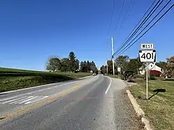 Pennsylvania Route 401 (PA 401) is a 20.2-mile-long (32.5 km) east–west state route in Berks and Chester counties, located in southeast Pennsylvania. The western terminus is at PA 23 in Caernarvon Township, across the county line from Elverson. The eastern terminus is at U.S. Route 30 (US 30) in East Whiteland Township, a short distance west of Malvern. PA 401 is called Conestoga Road its entire length and runs through rural areas with suburban development toward the eastern part of the route. PA 401 follows a former turnpike chartered in 1809 known as the Little Conestoga Turnpike. PA 401 was designated along Conestoga Road between PA 29 (Phoenixville Pike) and US 30/PA 1 in 1928. The route was extended west to PA 23 in the 1930s, at which time the entire length was paved.