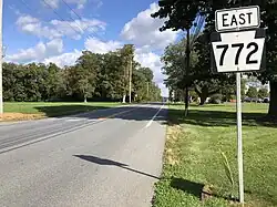 Pennsylvania Route 772 (PA 772) is an east–west 38.5-mile-long (62.0 km) state highway located in Lancaster County, Pennsylvania. The western terminus of PA 772 is at PA 441 in Marietta, and its eastern terminus is at U.S. Route 30 (US 30) just west of Gap. The route is mostly a two-lane road that passes through rural areas of the Pennsylvania Dutch Country to the north of the city of Lancaster. The highway goes through the boroughs of Mount Joy, Manheim, and Lititz, along with the villages of Rothsville, Leola, and Intercourse.