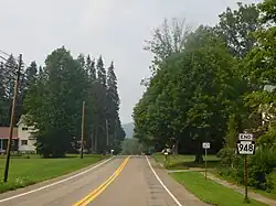 PA 948 begins at an intersection with PA 255 in Fox Township, Elk County, heading southwest on two-lane undivided Fairview Road. The road passes through rural residential areas, curving west into a mix of farmland, woodland, and homes. The route becomes Main Street and runs through the community of Kersey, where it passes residences and a few businesses. PA 948 becomes West Main Street Extended and heads west-northwest into wooded areas with some fields and development, becoming Shelvey Summit Road and passing through Shelvey. The road heads west between agricultural areas to the north and woodland to the south before heading into more wooded areas with some homes, curving northwest. The route heads into Ridgway Township and becomes Kersey Road, heading between woods to the northeast and farmland to the southwest with some development. PA 948 comes to an intersection with U.S. Route 219 (US 219) in Boot Jack and continues north-northwest concurrent with that route on Boot Jack Road.[2][3]