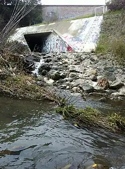 Looking west, from east side of Stevens Creek, at terminus of Permanente Creek Diversion Channel as it exits beneath Highway 85. Here Permanente Creek drops about ten vertical feet over cemented boulders, an impassable barrier to in-migrating steelhead trout, 2013.