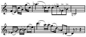 If the first three notes are regarded as the "original" cell, then the next 3 are its transposed retrograde-inversion (backwards and upside down), the next three are the transposed retrograde (backwards), and the last 3 are its transposed inversion (upside down).[5]