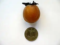Oriental persimmon, Chinese persimmon or Japanese persimmon[7] (Diospyros kaki) is the most commercially important persimmon. It is native to China, Northeast India and northern Indochina.[8][9] It was first cultivated in China more than 2,000 years ago, and introduced to Japan in the 7th century and to Korea in the 14th century.[10] China, Japan and South Korea are also the top producers of persimmon. It is known as shi (柿) in Chinese, kaki (柿) in Japanese and gam (감) in Korean and also known as Korean mango. It is known as haluwabed (हलुवाबेद) in Nepal and it is used for various culinary purposes and eaten as a seasonal fruit. In Nepal, it is one of the most popular fruits and has been consumed for a very long time. It was introduced to California and southern Europe in the 1800s and to Brazil in the 1890s, in the State of São Paulo, afterwards spreading across Brazil with Japanese immigrants; the State of São Paulo is still the greatest producer within Brazil, with an area of 3,610 hectares (8,900 acres) dedicated to persimmon culture in 2003;[11] It is deciduous, with broad, stiff leaves. Its fruits are sweet and slightly tangy with a soft to occasionally fibrous texture.