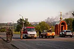 After several months of little military progress, in July 2014 the Ukrainian forces made sweeping territorial gains, capturing swathes of territory from pro-Russia rebels across Donbas.[29] On 25 July 2014 the Kyiv Post reported that the Ukrainian army push for the city was imminent, and that the separatists had been "chased" by the Ukrainian army from nearby settlements and intended to make Pervomaisk their "last stand".[30] Intense fighting for control of Pervomaisk between the pro-Russia separatists and the Ukrainian army broke out on 28 July 2014, and would wage on throughout August, with both sides claiming control of the city.[31][32] It would later be established that, despite heavy bombardment, the separatists had held Pervomaisk for the whole time.[33][34][35] By September 2014, separatist control of Pervomaisk was undisputed.[36][37]