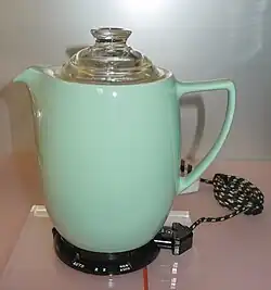 Peter Hobbs and Bill Russell opened their new business in Croydon in October 1952, and later the same year launched the world's first electric coffee percolator, dubbed the CP1.[4] This invention was soon followed by their launch of the K1 electric kettle in 1955. It was the first electric kettle with an automatic shutoff. The K1 was soon superseded by the K2, which had a more attractive appearance.[5] Both versions were expensive, but were built to last. The first K2 Kettles sold for £7, at a time when the average weekly wage was £14, but they became popular as wedding gifts. Russell Hobbs has reports of K2s still operational after 30 years, and, although they are now extremely rare, collectors will pay up to £200 for a K2 in mint condition.[6]