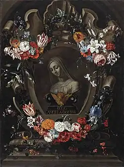 Garland paintings were usually collaborations between a still life and a figure painter.[9] Van Kessel's collaborators on his garland paintings have not been identified. Van Kessel would have painted the fruit and flower garlands while his collaborators would then have painted the figure or figures inside the cartouche. The Garland of flowers surrounding a stone cartouche enclosing a bust of the Virgin is an example of a garland painting attributed to van Kessel. The flowers in the painting resemble those of the Garland surrounding a stone cartouche with a chalice in the Staatsgalerie Bamberg, dated 1658.[11] Stylistically his garland paintings are close to those created by Jan van Kessel the Elder who may have been a family member.[6]