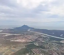 Right lower corner of the picture is the northern part of Petra Jaya. Further north are the Bandar Baru Samariang and Mount Santubong on the Santubong Peninsula. The Santubong River runs across these areas.