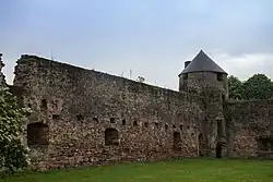 At the beginning of the 14th century Arnold of Pettingen married Marguerite of Rousy, the great granddaughter of Ermisinde. He had a son, Arnold the Young, whose daughter Irmengard, by marrying Jean de Créhange, associated the Lords of Pettingen with his renowned family. Their grandson, also called Jean, fought for René, the Duke of Lorraine in the war against Charles the Bold, Duke of Burgundy. In revenge, Charles completely destroyed the Castle of Pettingen whose treasures were confiscated by the Governor of Luxembourg in 1494. However, as a result of a decree made at the Great Council of Mechelen in 1503, half of the treasures were returned and the castle was reconstructed in its present form. The four corner towers were added in 1571. In 1684 Louis XIV's troops bombarded the castle, leaving it as it stands today. The ruins, which belonged to the house of Créhange, were inherited by the Comtes de Lapérouse whose descendants sold it to the Duke of Arenberg in 1837.[1] In 1910 his descendant, the Prince of Arenberg, removed everything of value from the castle. In 1920 the southern wall collapsed.[2]
