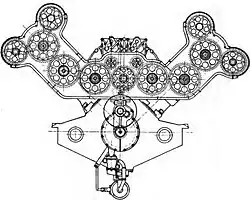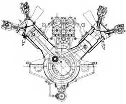 The engine's eight cylinders are in a 90 degree Vee arrangement and are made of cast iron formed in blocks of four with integral water jackets. In each cylinder head there are four inclined valves guided in bronze bushings. The engine's four camshafts (two per cylinder bank) are enclosed in aluminium housings and operate the valves through tappets.[6] The camshafts are hollow allowing lubricating oil to be fed directly to the camshaft bearings.[4] Pistons are machined from forged steel, and each is fitted with two piston rings. The engine is equipped with fork-and-blade connecting rods.[6]