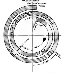 The Peugeot 8Aa's valve timing was considered conventional for an engine of its time period with no valve overlap. Both the exhaust valve closure and the inlet valve opening occur after top dead center.[4]