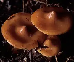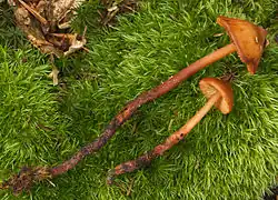The cap is initially conical before expanding to become broadly conical with a pointed umbo; it reaches a diameter of 2–5 cm (0.8–2.0 in). The cap surface is smooth, and marked by a variable number of raised radial grooves extending from the center of the cap to the margin. Depending on the age of the fruit body and the levels of moisture in the environment, the cap may be sticky or moist. When hydrated, the cap color is orange-red to yellow-brown; the color fades to reddish yellow, gold-colored, or tawny when dry. The cap flesh is the same color as the cap surface. The gills are slightly adnexed and seceding, and crowded closely together. They are initially pallid before becoming fulvous to deep reddish-yellow, slightly spotted, and shining. The stem is 6–8 cm (2.4–3.1 in) long by 0.4–0.6 cm (0.16–0.24 in) thick, and roughly equal in width throughout its length. The stem surface is smooth, and the stem flesh has a cartilage-like consistency. The base of the stem is radicating, that is, it extends deep into the substrate. Its color is dark red, lightening to pale reddish-yellow near the top.[5] The mushrooms have an odor and taste comparable to radishes or almonds. The mushroom is inedible.[6]