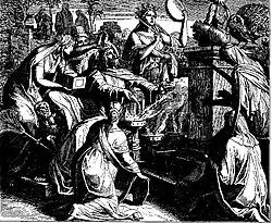 According to the Kebra Nagast of the Ethiopian Orthodox Tewahedo Church, Pharaoh's daughter tricked Solomon into committing idolatry by making him swear an oath. In the text she was upset that he has slept with the Queen of Sheba and fathered Menyelek (who is held to have taken the Ark of the Covenant with him when the Queen returned with him to Africa). Solomon at first resists her calls saying "I will neither sacrifice to nor worship thine idols, and I will not perform thy wish." So "one day she beautified and scented herself for him, and she behaved herself haughtily towards him, and treated him disdainfully. And he said unto her, "What shall I do? Thou hast made thy face evil towards me, and thy regard towards me is not as it was formerly, and thy beautiful form is not as enticing as usual. Ask me, and I will give thee whatsoever thou wishest, and I will perform it for thee, so that thou mayest make thy face (or, attitude) gracious towards me as formerly"; but she held her peace and answered him never a word. And he repeated to her the words that he would do whatsoever she wished, and she said unto him, "Swear to me by the God of Israel that thou wilt not play me false." And he swore to her that he would give her whatsoever she asked for, and that he would do for her everything that she told him. And she tied a scarlet thread on the middle of the door of [the house of] her gods, and she brought three locusts and set them in the house of her gods. And she said unto Solomon, "Come to me without breaking the scarlet thread, bend thyself and kill these locusts before me and pull out their necks"; and he did so. And she said unto him, "I will henceforward do thy will, for thou hast sacrificed to my gods and hast worshipped them." Now he had done thus because of his oath, so that he might not break his oath which she had made him to swear, even though he knew that it was an offence (or, sin) to enter into the house of her gods."[14]