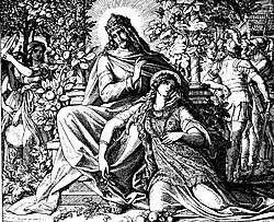 Pharaoh's daughter is a main figure in a three-act oratorio called Solomon written by the composer George Frideric Handel. It was composed "between May 5th and June 13th 1748 and it was first performed at Covent Garden on March 17th 1749".[28] The first act deals with the dedication of the temple and Solomon's marriage to Pharaoh's daughter. The second act is about the story of his judgement between the two women both claiming the same baby. The third act is about the visit of the Queen of Sheba, "who is dazzled by his wisdom and the splendour of his court."[28]