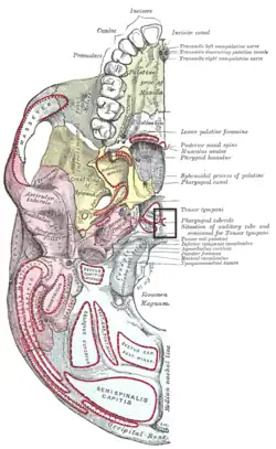 Base of skull. Inferior surface. (Pharyngeal tubercle labeled at right, eighth from the bottom.) | |