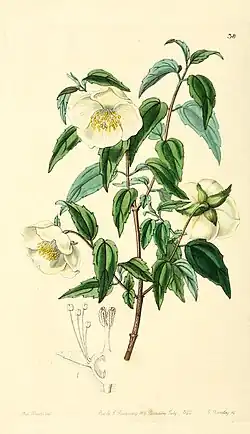 Philadelphus mexicanus is a shrub belonging to the genus Philadelphus, native to Mexico and Guatemala. It is a spreading, evergreen shrub with pendent, bristly shoots and ovate, sometimes partly toothed leaves up to 11 centimetres (4.3 in) long. Flowers are single, cup shaped, rose scented, creamy white in colour, measuring up to 4 centimetres (1.6 in) across. 'Rose syringa' (syn. Philadelphus maculatus) is the most commonly cultivated variety and has fragrant white flowers with a purple blotch in the centre.