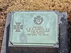 On 22/23 April 1951 near the Imjin River, Korea, during a heavy enemy attack, No. 1 platoon under the command of Lieutenant Curtis, was ordered to carry out a counter-attack which was initially successful, but was eventually held up by heavy fire and grenades. The lieutenant then ordered some of his men to give covering fire while he himself rushed the main position of resistance. In this charge he was severely wounded but he insisted on making a second attempt. While making another desperate charge he was killed when within a few yards of his objective after throwing a grenade which destroyed the enemy position immediately after.[3]