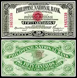 Philippine National Bank, 50 Centavos (1917). Emergency circulating note for World War I.