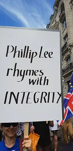 Lee was opposed to Brexit prior to the 2016 referendum.[32] He resigned as a minister on 12 June 2018. In a widely reported resignation statement, he said that his reason was so he could "better speak up for my constituents and country over how Brexit is currently being delivered". He went on to warn that the current approach to Brexit would damage businesses in his constituency, and that he could not support the government's opposition to Parliament deciding what happens if it rejects the final deal "because doing so breaches such fundamental principles of human rights and Parliamentary sovereignty".[1] In early 2019 he became chair of Right to Vote,[33] having already joined the People's Vote campaign for a public vote on the final Brexit deal between the UK and the European Union.[34] On 1 June 2019 Bracknell Conservative Association passed a motion of no confidence in Lee, partly due to clashes over Lee's stance on Brexit, and partly due to disatisfaction with his performance as the local MP. [35]