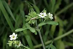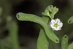 The inflorescence consists of cymes of 2 to 10 flowers each under a centimeter wide. Each pedicel is 5–20 millimetres (0.2–0.8 in). Calyx lobes are oblong and 1–3 millimetres (0.04–0.12 in). The flower is white, usually with a purple spot or streak on each of its five lobes.[2]