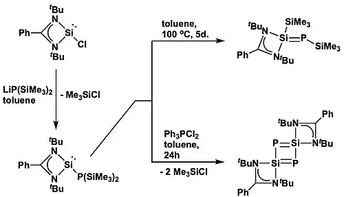 Phosphasilenes with 4-coordinate silicon, which can also be viewed as silylene-stabilized phosphinidene, can be synthesized based on the reactivities of stable silyene complexes.[2] For example, Inoue and coworkers demonstrated that benzamidinate-stabilized phosphanylsilylene can give rise to corresponding Si- and P-trimethylsilyl-substituted phosphasilene via thermal rearrangement, while the reaction can also yield 4-disila-1,3-diphosphacyclobuta-diene with the addition of a mild chlorinating agent Ph3PCl2.[12][2] In these phosphasilenes with four-coordinate silicon, even though formally five bonds are drawn around silicon, the Si–P π bonds are calculated to be strongly polarized towards the P atoms. The contribution from phosphorus and silicon to the π orbitals are calculated to be 87.53% and 12.47%, respectively.