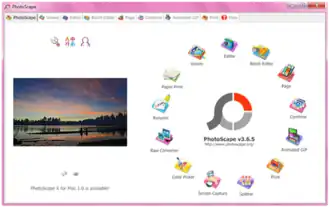 PhotoScape is a graphics editing program, developed by MOOII Tech, Korea. The basic concept of PhotoScape is 'easy and fun', allowing users to easily edit photographs taken from their digital cameras or even mobile phones. PhotoScape provides a simple user interface to perform common photo enhancements including color adjustment, cutting, resizing, printing and GIF animation.[1][2] Photoscape operates on Microsoft Windows and Mac and is available on Linux systems as a Snap package.[3] The default languages are English and Korean, with additional language packages available for download.