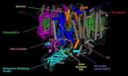4. ^ a b Guskov A, Kern J, Gabdulkhakov A, Broser M, Zouni A, Saenger W (March 2009). "Cyanobacterial photosystem II at 2.9-A resolution and the role of quinones, lipids, channels and chloride". Nature Structural & Molecular Biology. 16 (3): 334–42. doi:10.1038/nsmb.1559. PMID 19219048. S2CID 23034289.