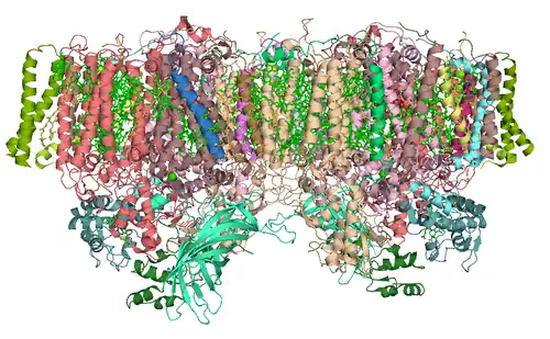 1. ^ Loll B, Kern J, Saenger W, Zouni A, Biesiadka J (December 2005). "Towards complete cofactor arrangement in the 3.0 A resolution structure of photosystem II". Nature. 438 (7070): 1040–4. Bibcode:2005Natur.438.1040L. doi:10.1038/nature04224. PMID 16355230. S2CID 4394735.