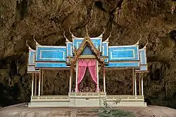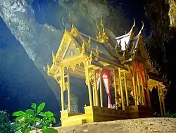 The Phraya Nakhon cave (Thai: ถ้ำพระยานคร, romanizedTham Phraya Nakhon) is a cave in Khao Sam Roi Yot National Park, Hua Hin, Prachuap Khiri Khan Province, Thailand.[1] It features the royal Kuha Karuhas Pavilion, illuminated by natural sunlight through a large skylight.[1][2] The cave is accessible by a forested hike and has two chambers with rock formations as well as ancient inscriptions.[3]