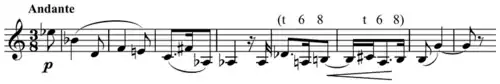 The piece features consistent use of the twelve-tone technique and only one tone row ("the language is very systematic, it's the true dodecaphonic Schoenberg",[8]) though not as strictly as Schoenberg once required (for example, the ninth, tenth and eleventh tones of the series are repeated before the twelfth tone is first heard). The opening melody is thirty-nine bars long and presents all four modes of the tone row in the following order: basic set, inversion of retrograde, retrograde, and inversion. Both of the inversions are transposed.[4] Four different types of row partitioning are evident: linear, by dyads or tetrachords, free, and by trichords. Linear presentations are ordered, strict presentations of either complete rows or component hexachords, and dominate the Andante and Giocoso movements. The second type symmetrically divides the twelve-tone aggregate into either six dyads or three tetrachords, and is found in the Molto allegro. The third type consists of irregular presentations of segments or fragments of the row, and is used mainly in the Adagio section. The last type, trichordal partitioning, is found throughout the concerto, and is a two-dimensional design created from the discrete trichords of complexes made from pairs of inversionally combinatorial rows.[9]
