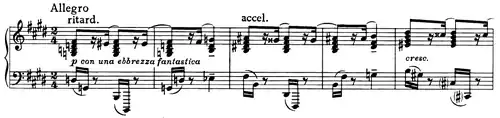 The work features one of the strange occurrences of the complete mystic chord spelled in fourths (mm. 264 and 268). Jim Samson[9] points out that it fits in well with Scriabin's predominantly dominant quality sonorities and harmony as it may take on a dominant quality on C or F♯. This tritone relationship between possible resolutions is important to Scriabin's harmonic language, and it is a property shared by the French sixth (also prominent in his work).