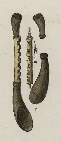 The pibgorn is a Welsh species of idioglot reed aerophone. The name translates literally as "pipe-horn". It is also historically known as cornicyll and pib-corn.[1] It utilises a single reed (Welsh: "cal", or "calaf"), cut from elder (Sambucus nigra) or reed (Arundo phragmites), like that found in the drone of a bagpipe, which is an early form of the modern clarinet reed. The single chambered body of the elder pipe has a naturally occurring parallel bore, into which are drilled six small finger-holes and a thumb-hole giving a diatonic compass of an octave. The body of the instrument is traditionally carved from a single piece of wood or bone (See photograph right). Playable, extant historical examples in the Museum of Welsh Life have bodies cut and shaped of elder. Another, unplayable instrument at the Museum, possibly of a later date, is made from the leg bone of an unspecified ungulate[2] (See photograph right). Contemporary instruments are turned and bored from a variety of fruitwoods, or exotic hardwoods; or turned from, or moulded in plastics. The reed is protected by a reed-cap or stock of cow-horn. The bell is shaped from a section of cow-horn which serves to amplify the sound. The pibgorn may be attached to a bag, with the additional possibility of a drone, which is then called pibau cwd; or played directly with the mouth via the reed-cap.[3]