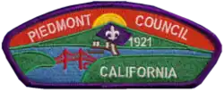 The Piedmont Council (California) of BSA serves chartered organizations and BSA units located in the city of Piedmont, located in the East Bay hills and surrounded by the city of Oakland. The council itself is surrounded by the Golden Gate Area Council. The council was first chartered in 1921, and geographically is the smallest in the BSA, but has a high level of activity and serves a high percentage of the available youth living in Piedmont. The council is home to units of Scouts BSA, Cub Scouts, Venturing Crews, Police Adventures and Sea Scouts.[1]