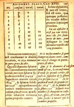 Hérigone also created a number alphabet for remembering long numbers in which phonemes were assigned to different numbers, while the vowels were supplied by the memorizer: 1 (t, d), 2 (n), 3 (m), 4 (r), 5 (l), 6 (j, ch, sh), 7 (c, k, g), 8 (f, v, ph), 9 (p, b), 10 (z, s).