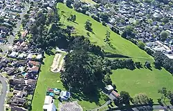 The hill has several known traditional names in Māori. One is Te Pakuranga-Rāhihi, shortened to Pakuranga, which refers to a legendary battle between the supernatural Tūrehu people that begun at the hill.[7][8][9] Two other names include Pukepane and Ōhuiarangi,[8] the latter which literally means "the desire of Rangi".[4] refers to the early Tāmaki Māori ancestress Huiarangi, daughter of Tāmaki and granddaughter of Maruiwi of the early iwi Te Tini o Maruiwi and Ngāti Ruatāmore, an ancestor of Ngāi Tai ki Tāmaki.[8][9] When Tāmaki Makaurau was visited by the ancestor Toi-te-huatahi, Huiarangi was one of the most prominent Te Tini o Maruiwi figures in the early settlement of Tāmaki Makaurau.[9]