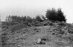 Early European settlers named the hill Pigeon Mountain, after the many kererū feeding on the pigeonwood trees seen here.[6][7] The mountain was extensively quarried from 1913 to the 1970s, with the entire north half of the volcano removed.[4] It was first quarried for roading metal by Fencibles from the 1847 Fencibles settlement at Howick. In the 1920s the Shaw brothers worked with Harold Kearney, Dud Langdon and Jim Taylor using a pair of draught horses to pull a dray loaded with metal.[12] In 1848 John Campbell and James Smyth, both from the fencible ship Sir Robert Sale, had the contract to spread metal on the road from Howick to Panmure, for which they were paid 5/- per day. At that time the mountain was named Pigeon Tree Hill.[13]