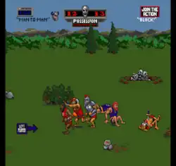 The player directly controls one member of a five-man team, with the object of carrying a football over the opposing team's goal line. The playing area is littered with hazards such as pits, bushes and logs. A ball carrier who trips over any of these, or who is punched by an opponent, fumbles the ball. The field is also laden with weapons: axes, maces, nooses, scythes, spears, swords and torches. A player can pick up one of these by running over it. It will appear at the top of the screen next to the player's score as a "concealed weapon", several weapons may be carried at once and one may be carried over after a touchdown. The ball carrier can be "grappled", essentially a mass tackle into which multiple characters can jump. Having a concealed weapon as well as having more characters jump into the grapple greatly increases a team's chance of gaining or retaining possession, although weapons cannot be used if both team captains are in the grapple. A character who is injured by a concealed weapon is out of play until a touchdown is scored.