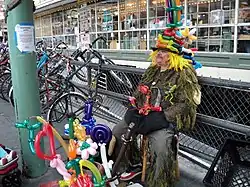 Jump blues musician PK Dwyer is credited with forming the first-ever street band to busk at the Market. He formed that band, Felix & the Freelicks, shortly after he arrived in the Pacific Northwest in 1971. The band evolved into various other alignments, including (successively) the Dynamic Logs, the Jitters, Throbbing Gems, the Royal Famille du Caniveaux / Gutter People of Paris, all of whom played at the Market.[107] Some of these alignments also included Ron Bailey;[108] the Dynamic Logs included Orville Johnson as well.[109] The band, Morrison Boomer, is a more recent staple and known to record live music at the market.[110]