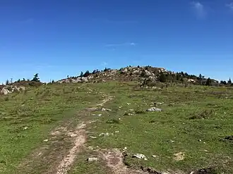 Pine Mountain is a mountain in the Blue Ridge Mountains. It is located in the Mount Rogers National Recreation Area of the Jefferson National Forest, within Grayson County, Virginia, United States.[1] The peak is immediately east of the highest mountain of Virginia, Mount Rogers, and Pine Mountain's sparsely vegetated summit has excellent views of both Mount Rogers and the surrounding region. The Appalachian Trail passes within feet of the summit.[2] Pine Mountain is the second highest named summit in Virginia, though because its topographic prominence is well under 300 feet, it is considered a subsidiary peak of Mount Rogers.