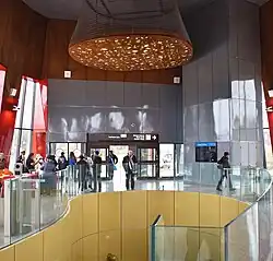 LightSpell, an interactive artwork by German artists Tim and Jan Edler, was installed at Pioneer Village at a cost of $1.9 million.[12] This installation comprises 40 light fixtures suspended from the platform ceiling, designed to display text messages of up to eight characters submitted by passengers via touchscreens.[13][14] However, when the Toronto–York Spadina subway extension (TYSSE) opened, the TTC opted not to activate LightSpell out of concern that passengers could use it to display offensive content,[15] despite TTC By-law No. 1 prohibiting such language.[16] Despite efforts by the TTC to reach a compromise with the artists,[15][17] as of August 2024, the installation had yet to be activated.[18]