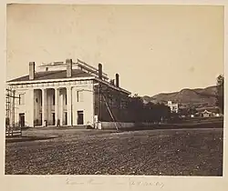 When the church was first organized, people normally met in one room of a house or the upstairs of a building. However, once the church had gathered in Utah, one room buildings were built and used as meeting houses, but also served other, often secular purposes. As years went, on more established designs including columns and steeples began to be included in the development of meetinghouses. The use of columns and steeples was a style that was known as "eclectic or of vernacular 'high style.'"[5] This style was a simple, yet effective architectural style in providing religious enlightenment with the steeple symbolizing the connection between heaven and earth.[6]