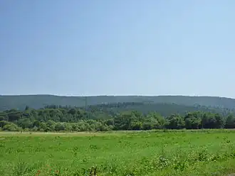 The tallest mountain in the Beskid Dukielski,[3] Piotruś is relatively flat-structured, giving it its alternative name of Płazyna.[4] The mountain is crescent-shaped, aligned roughly north-south. It is bounded to the west and south by the valley of the Jasiołka river, separating it from Ostra Mountain to the south.[2] The mountain is covered in forest, primarily old beech trees, and near the top, in birch, European mountain-ash and alder.[3] A spruce forest on Piotruś's western slope was mostly destroyed in a fire during the interwar period. A yellow sandstone rock is prominently displayed at the top of the mountain, which likely contributed to its name (Piotr – Polish for Peter – also means stone). Some of it was excavated for buildings, and several unused large blocks can be found.[4]