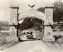The Pisgah National Forest was established in 1916, one of the first national forests in the eastern United States. The new preserve included approximately 86,700 acres (35,100 ha) that had been part of the Biltmore Estate, but were sold to the federal government in 1914 by Edith Vanderbilt. Some of the forest tracts were among the first purchases by the Forest Service under the Weeks Act of 1911. While national forests had already been created in the western United States, the Weeks Act provided the authority required to create national forests in the east as well.[3] Although tracts in the future Pisgah National Forest were among the first purchased under the Weeks Act, the very first to receive formal approval was the 31,000-acre (130 km2) Gennett Purchase in northern Georgia.[4] On March 25, 1921 Boone National Forest was added to Pisgah, and on July 10, 1936, most of Unaka National Forest was added. In 1954 the Pisgah National Forest was administratively combined with the Croatan and Nantahala national forests, collectively known as the National Forests of North Carolina.[5]