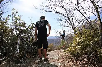 View from Black Mountain Trail in Pisgah National Forest. Mountain bikers take a break near the summit of Black Mountain.