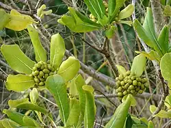 The leaves are obovate with margin entire and wavy, conspicuous net veining, crowded at ends of branches. Often with a single mis-formed leaf. The midrib has a yellow colour and the leaf has a brilliant green colour when viewed against the light. Fruit borne in clusters at the end of branches, yellow becoming brown, dehiscent with four bright red seeds covered with a sticky exudate with a faintly sweet smell. The bark has brown lenticels.
