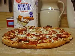 American pizza (particularly thin-crust) is made with a very high-gluten flour (often 13–14% protein content) of the type also used to make bagels; this allows the dough to be stretched thinly and thrown vigorously without tearing. Unlike Italian pizza,[15] American pizza often has vegetable oil or shortening mixed into the dough. This can range from a small amount in relatively lean doughs, such as New York–style, to a very large amount in some recipes for Chicago-style deep-dish dough.[16]