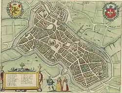 The first map of Lille is by Deventer in 1560[37] or Guicciadrini in 1580, with the Grand-Place in the center of the map.[42]