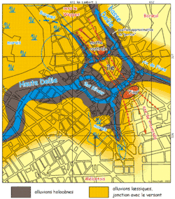 Superimposition of a map of Lille today and a supposed map of Lille in the Middle Ages: the Grand Place is in the alluvial zone of the Deûle.