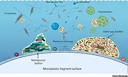 The plastisphere is a human-made ecosystem consisting of organisms able to live on plastic waste. Plastic marine debris, most notably microplastics, accumulates in aquatic environments and serves as a habitat for various types of microorganisms, including bacteria and fungi.[1][2] As of 2022, an estimated 51 trillion microplastics are floating in the surface water of the world's oceans.[3] A single 5mm piece of plastic can host 1,000s of different microbial species.[4] Some marine bacteria can break down plastic polymers and use the carbon as a source of energy.