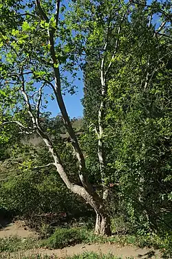 Platanus racemosa is a species of plane tree known by several common names, including California sycamore, western sycamore, California plane tree, and in North American Spanish aliso.[1] Platanus racemosa is native to California and Baja California, where it grows in riparian areas, canyons, floodplains, at springs and seeps, and along streams and rivers in several types of habitats.[1][2][3] It can be found as far north as Tehama and Humboldt counties.