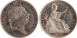 In the late 1820s, the British Royal Mint produced several trial coins as part of experiments on the use of platinum in coins. One of these coins has the same diameter as a farthing and a weak relief owing to the high hardness of platinum. The 1812 Pattern 9 Pence Bank Token (S3773A) was used for the obverse and the farthing of 1825 for the reverse parts of this coin. No dies were manufactured for these experiments, so expired dies of the corresponding coins were used instead. Coins minted using dies from two different coins are called mules. The coin bears the year of 1825, but was likely printed at a later date. Like all test coins, the platinum farthing has a high historic and numismatic value. This coin is also interesting because it features the portrait of the already deceased monarch George III (1738–1820).[3]