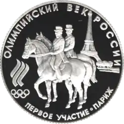 Reverse: two horse riders – Russian participants of the II Olympic Games, right – the Eiffel Tower, left – the emblem of the Russian Olympic Committee, around: "OLYMPIC AGE OF RUSSIA, FIRST PARTICIPANCE · PARIS"